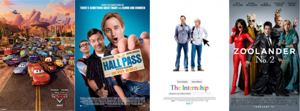Owen Wilson is a big part of 4 movies I watched recently, voicing the lead in Cars (2006 animated comedy), and playing the best friend in 3 live action comedies, Hall Pass (2011 with Jason Sudeikis), The Internship (2013 with Vince Vaughn), and Zoolander 2 (2016 with Ben Stiller). I had seen all but Zoolander 2 before, finding them all funny with bits of heart thrown in, and Owen Wilson usually plays a goofy but likeable co-lead in comedies, half of which are usually family friendly. I was on vacation when I watched these films so its like Wilson was a travel companion, a part he has also played before (both as a travel buddy and a third wheel). He excels at comedies, usually as a best friend or a charming cameo, and has also been trying to extend his range into action, thrillers, and dramas. Here are 4 of his comedic performances.