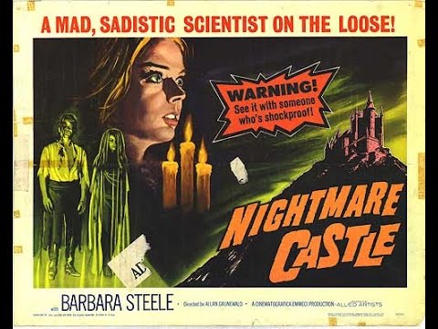 I bought one of those, “19 terrifying movies in one mega collection” dvd sets years ago. Still working on it and the latest one I watched is Nightmare Castle. This black and white thriller from Italy is about a scientist who kills his cheating wife and her lover and tries to cheat her sister out of her inheritance. Watching the film is difficult with the amount of darkness on the screen (although faces or anything dressed in white seems to float in mid-air), the instrumental music distractingly fluctuates in volume, (composed by Ennio Morricone), and the special effects are obviously low budget and made in 1965 (as is the rest of the film). The scientist played by Paul Muller would be creepy in proper lighting, (makes a good villain), there are lots of interesting moving shots in the castle, (also still shots of character’s eyes), and the scenes with violence grabbed my attention, (more intended so than what you see and sometimes out of place against the rest of the film). The film’s pacing serves the building of tension, making me wonder what will the scientist get in the end, and will any other character figure out what he is up to. Both Barbara Steele and Helga Liné steal scenes fighting with the scientist, battling possible mental health issues, and moving around the screen in a manner perfectly suited for a thriller set at a dark castle. I wish I heard this film without the English dub.